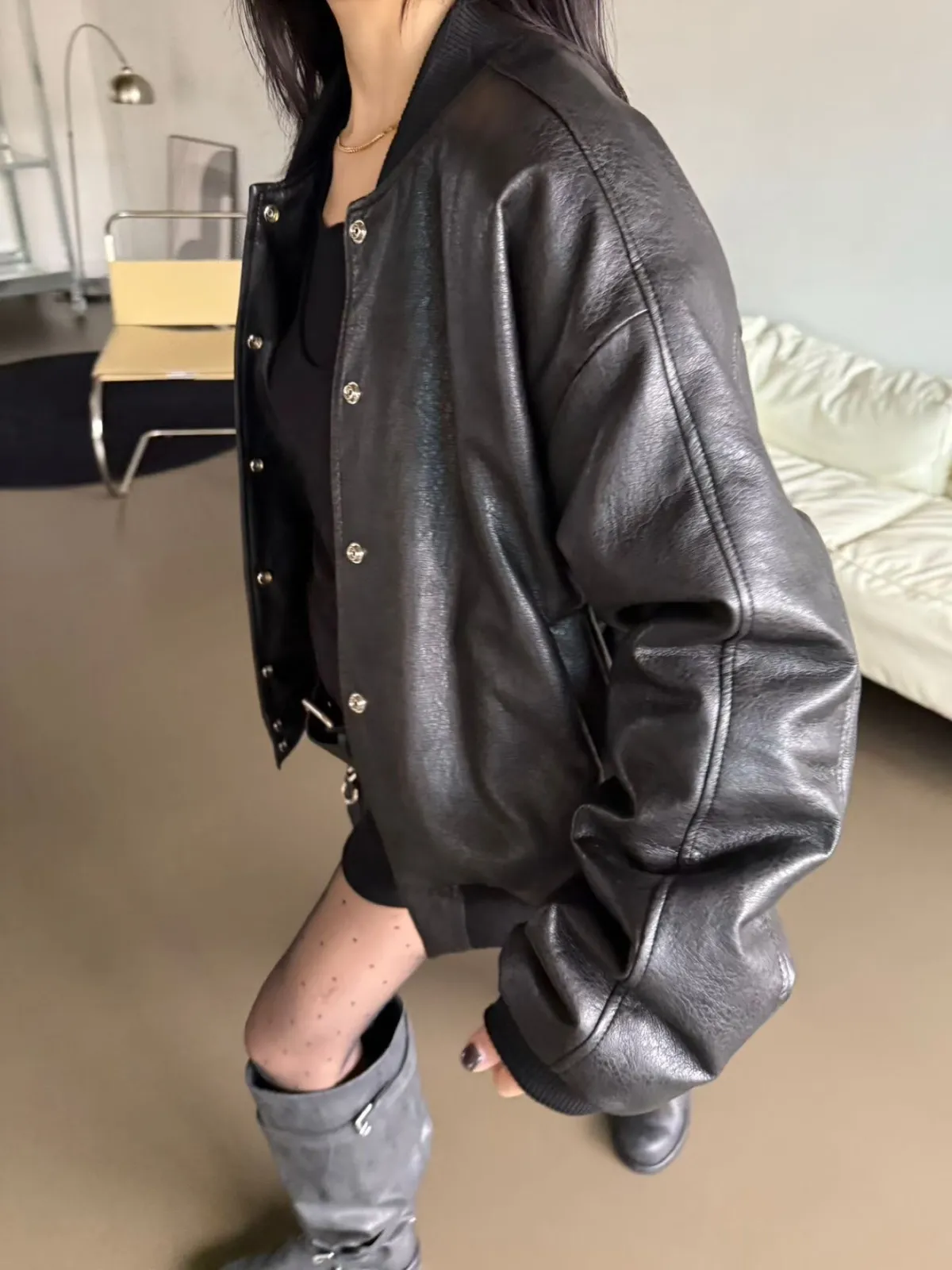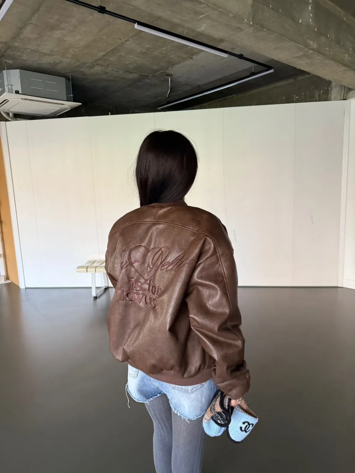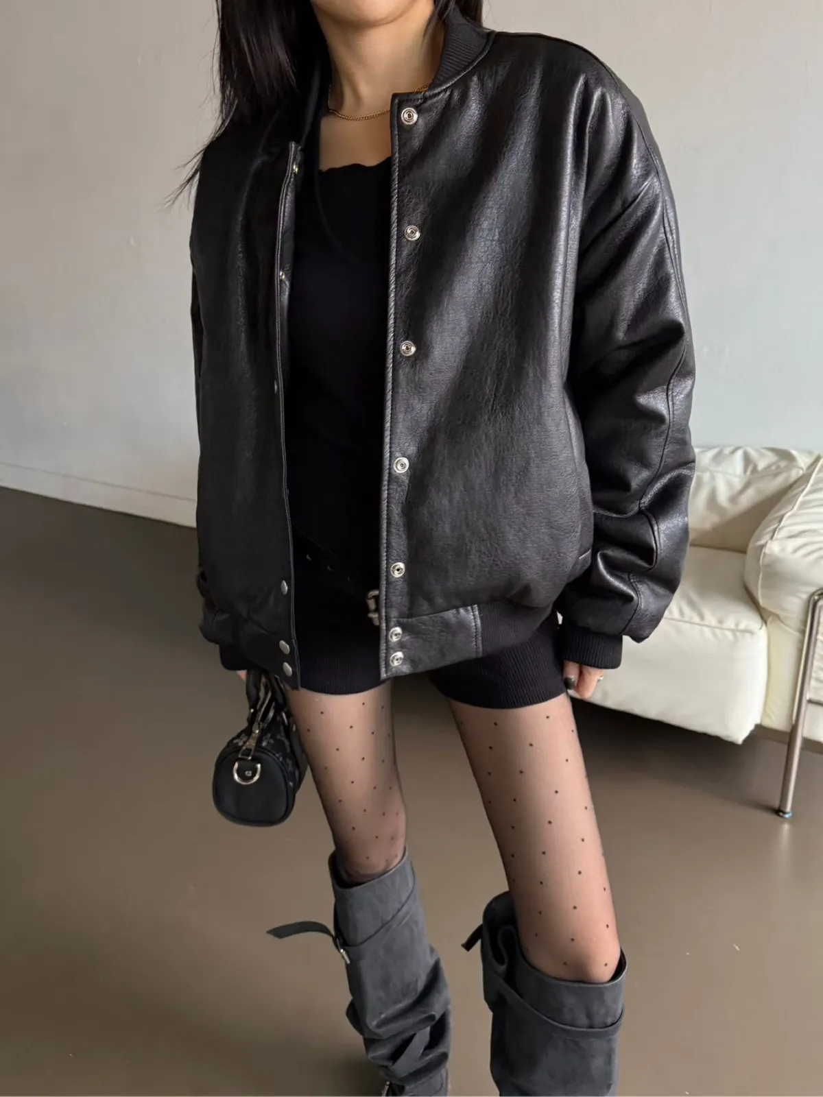 後刺繡字母羊羔毛內裡皮革棒球外套 2色