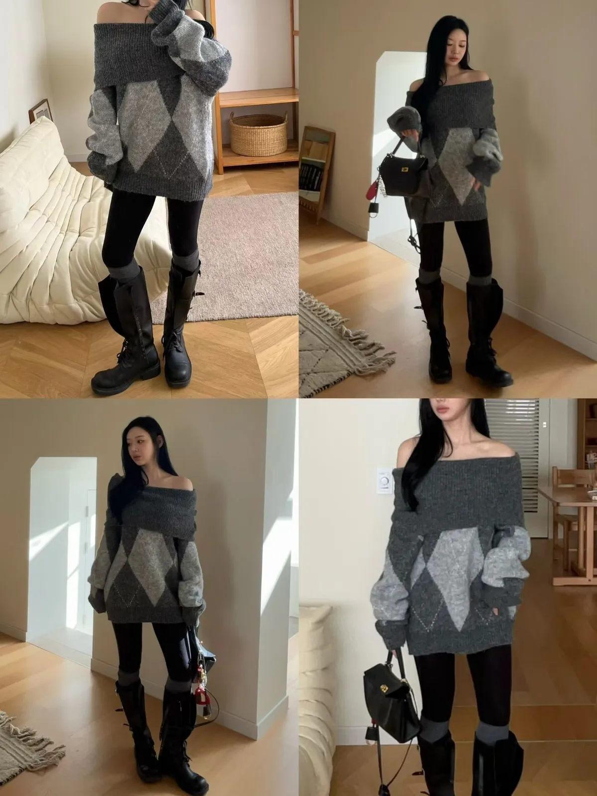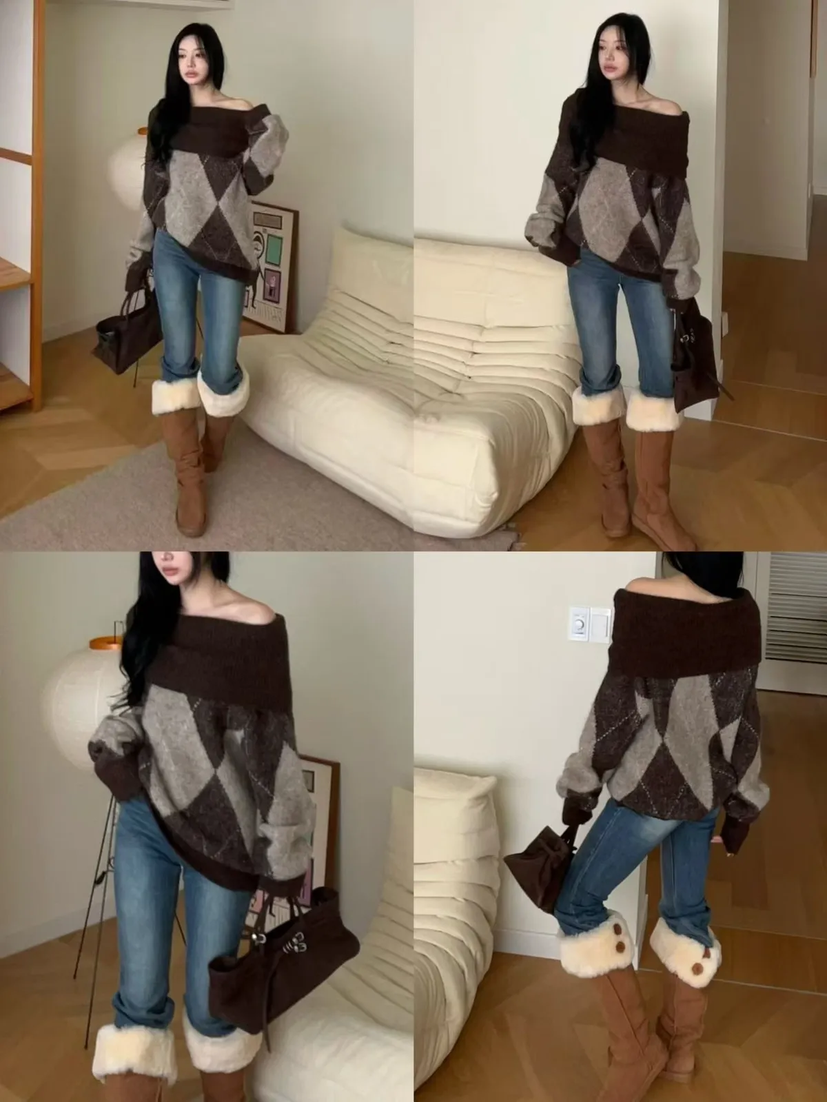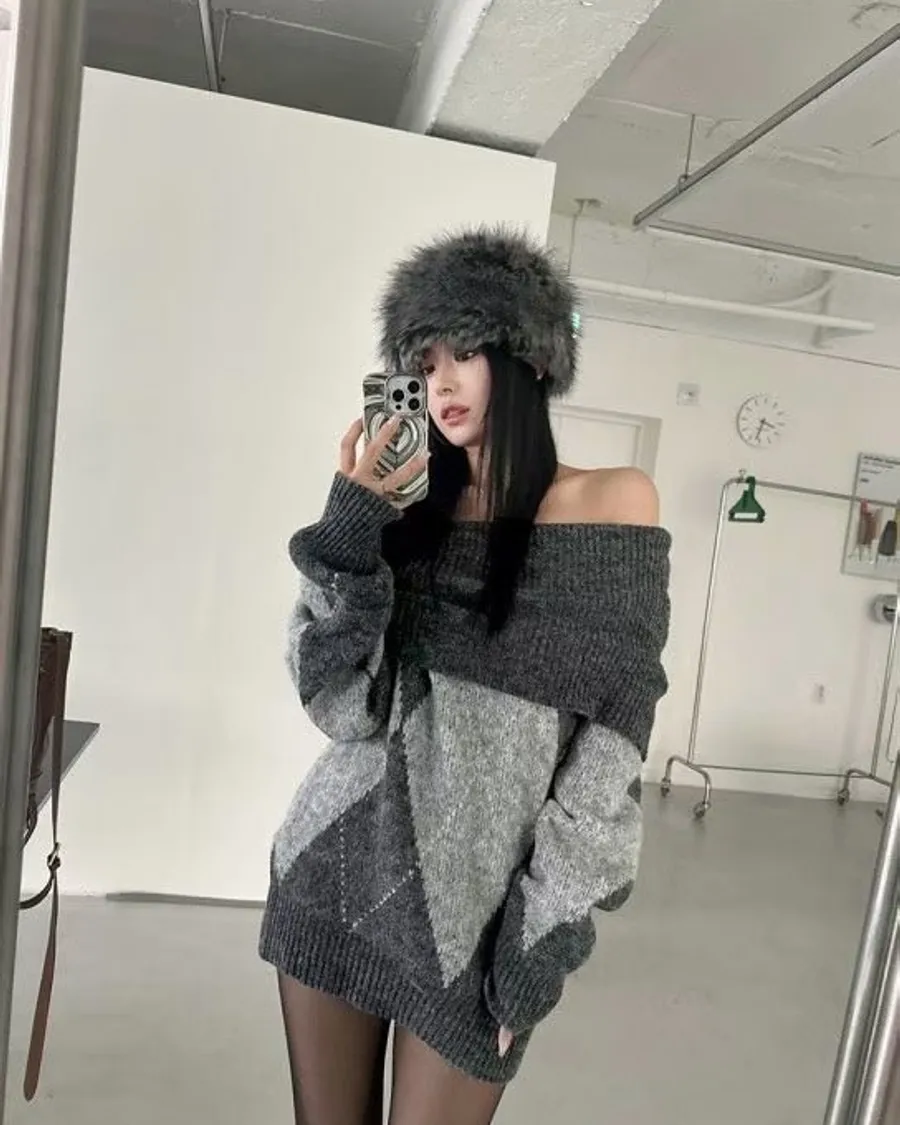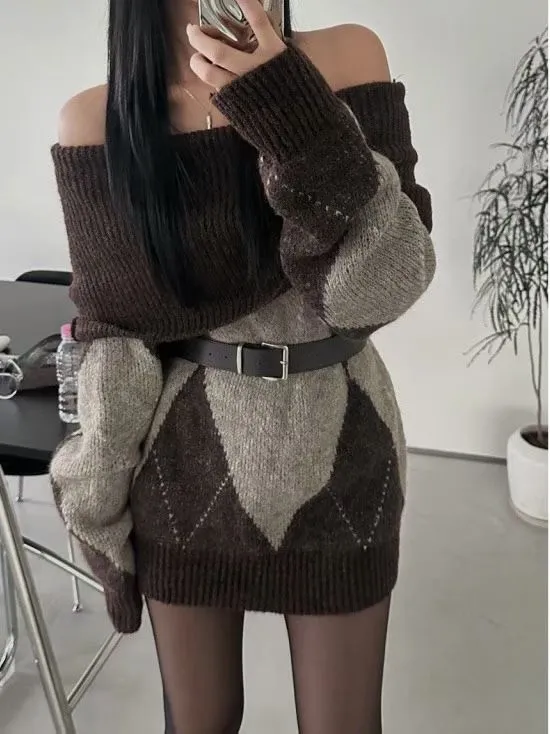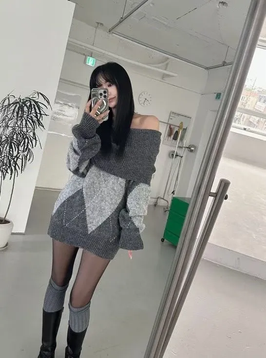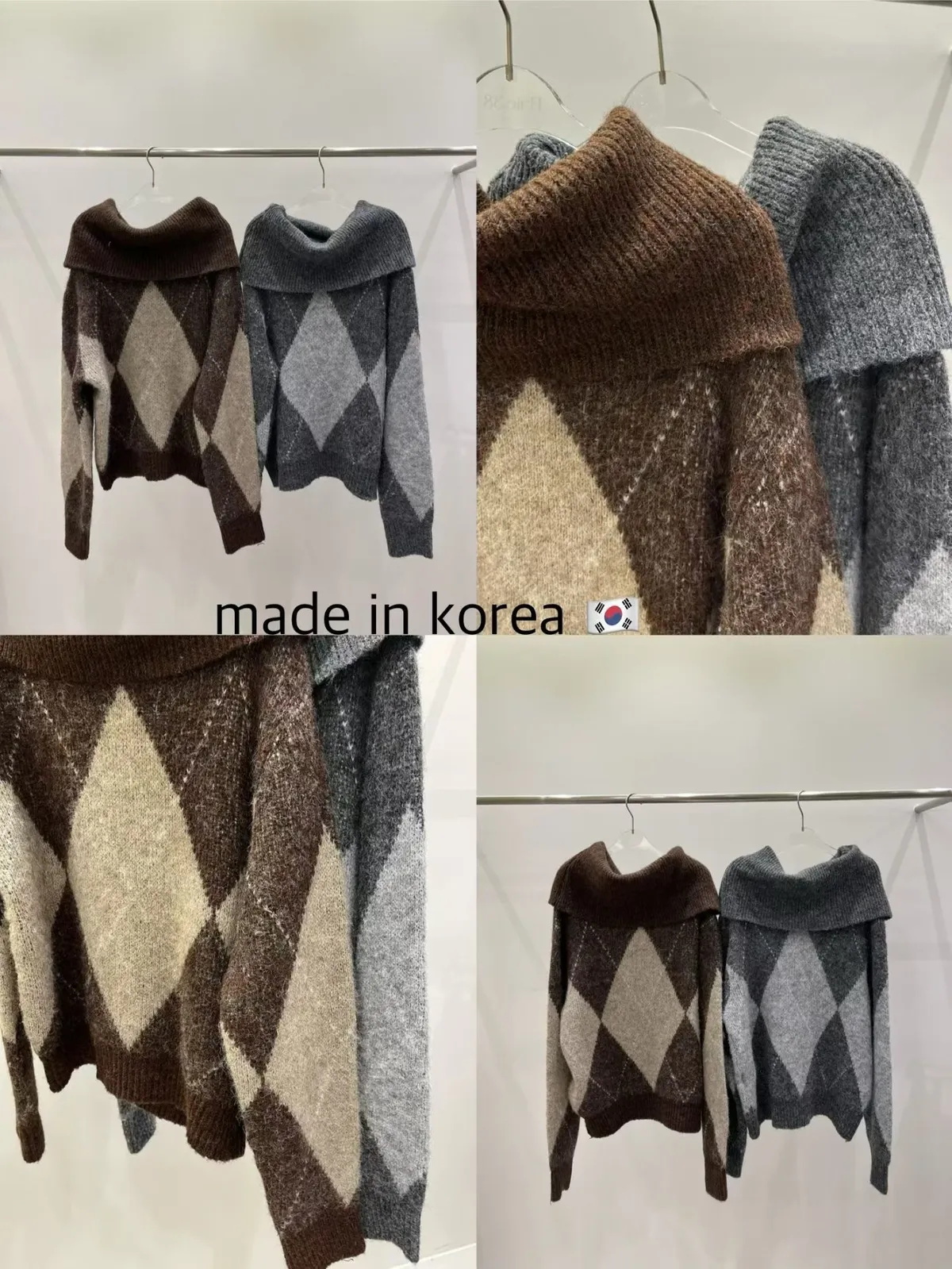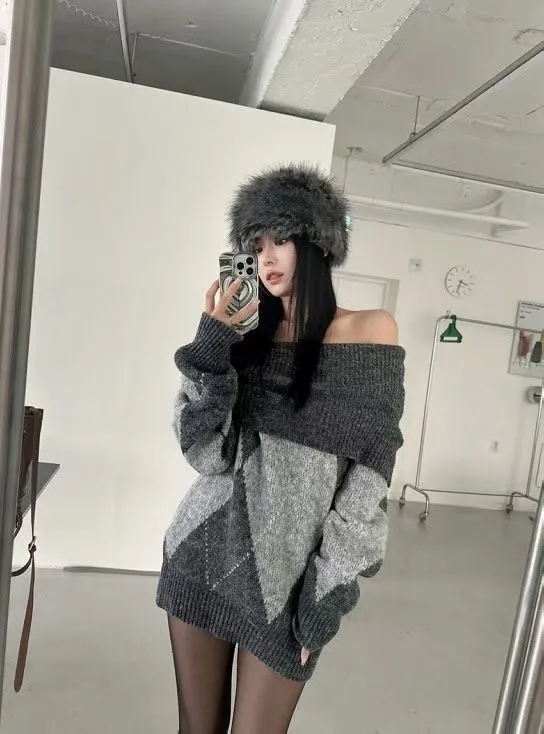 羊毛20% 大翻領露肩菱格紋毛衣2色