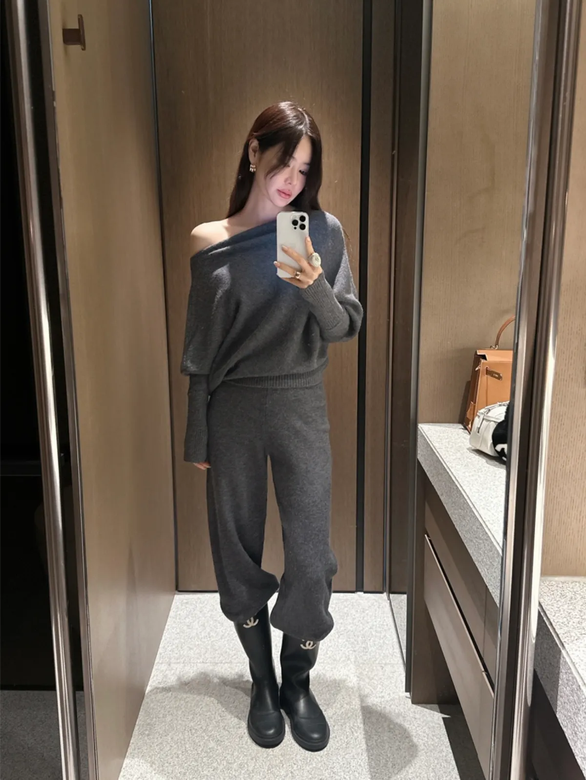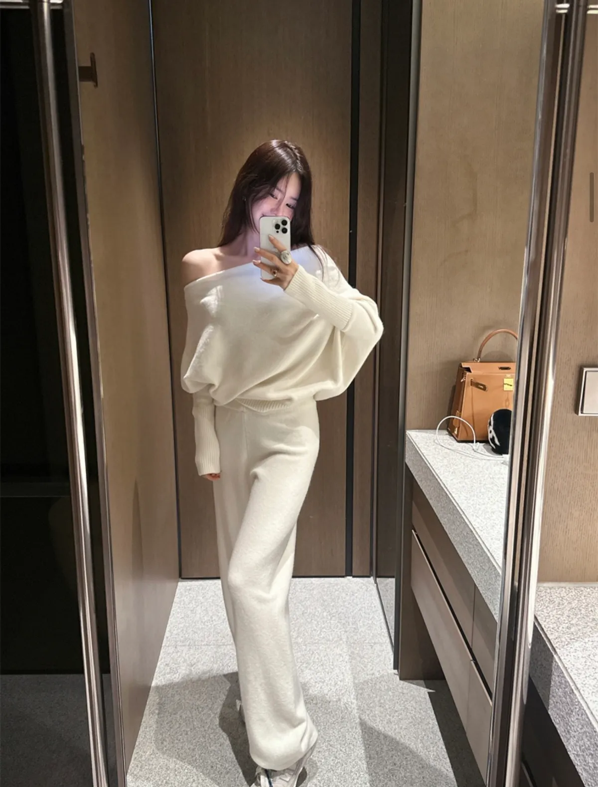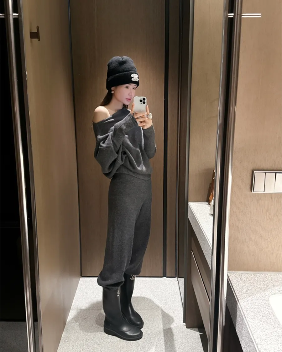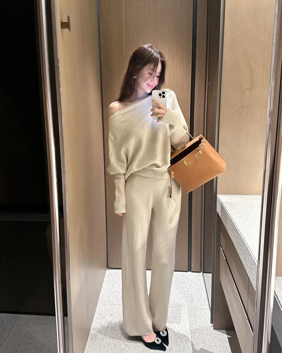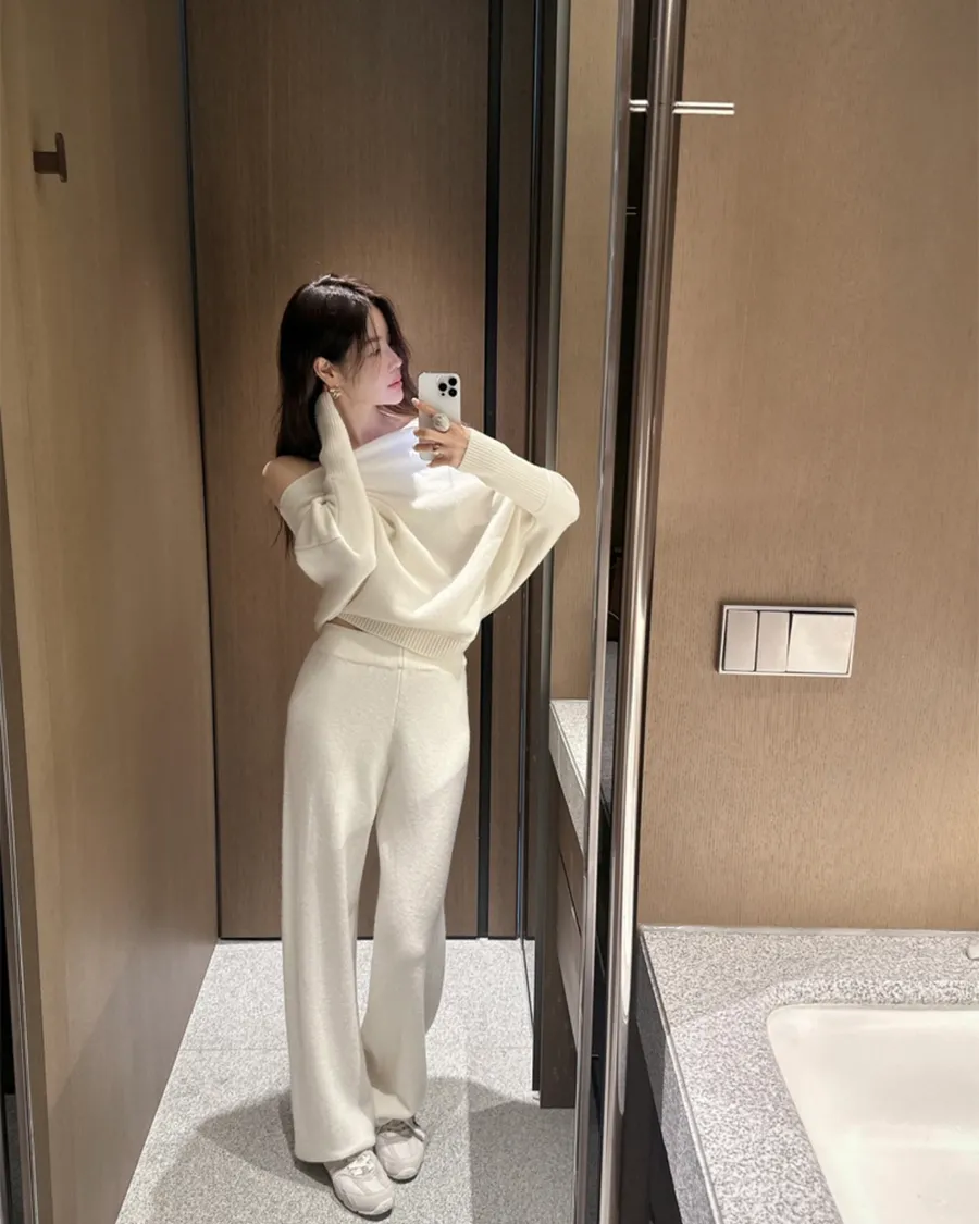 不對稱肩線增添時尚感的針織衫和褲子組成的單品。