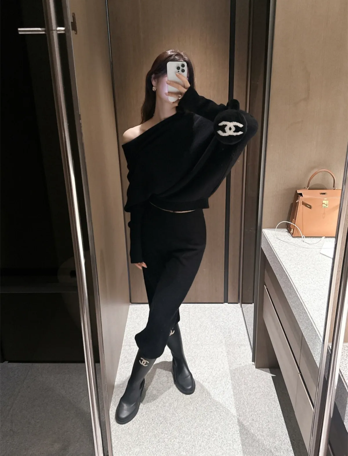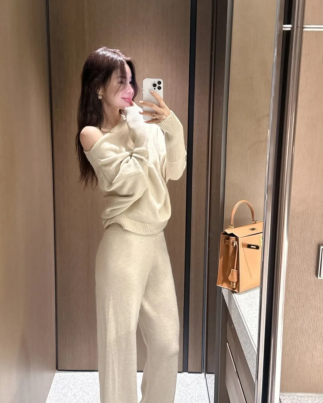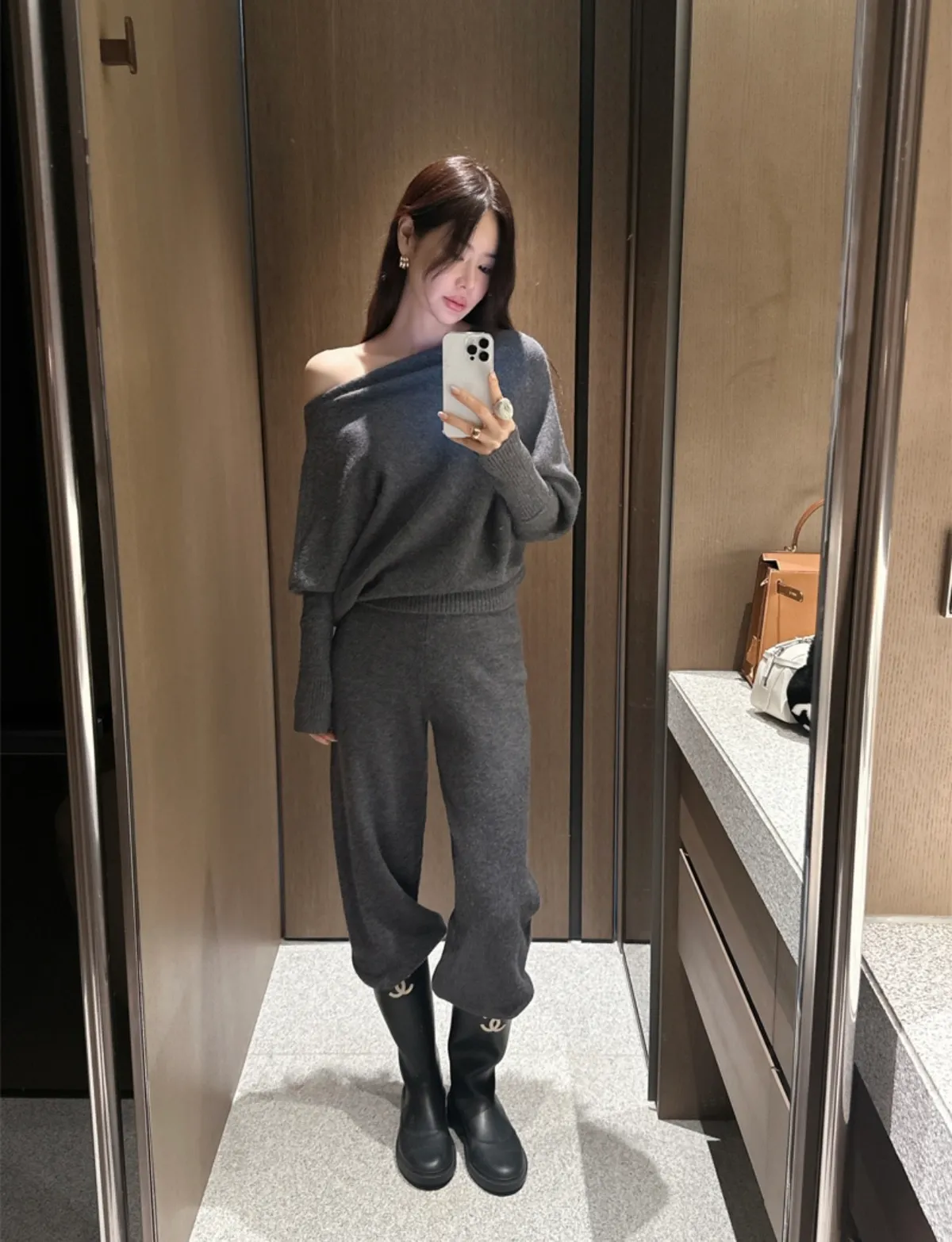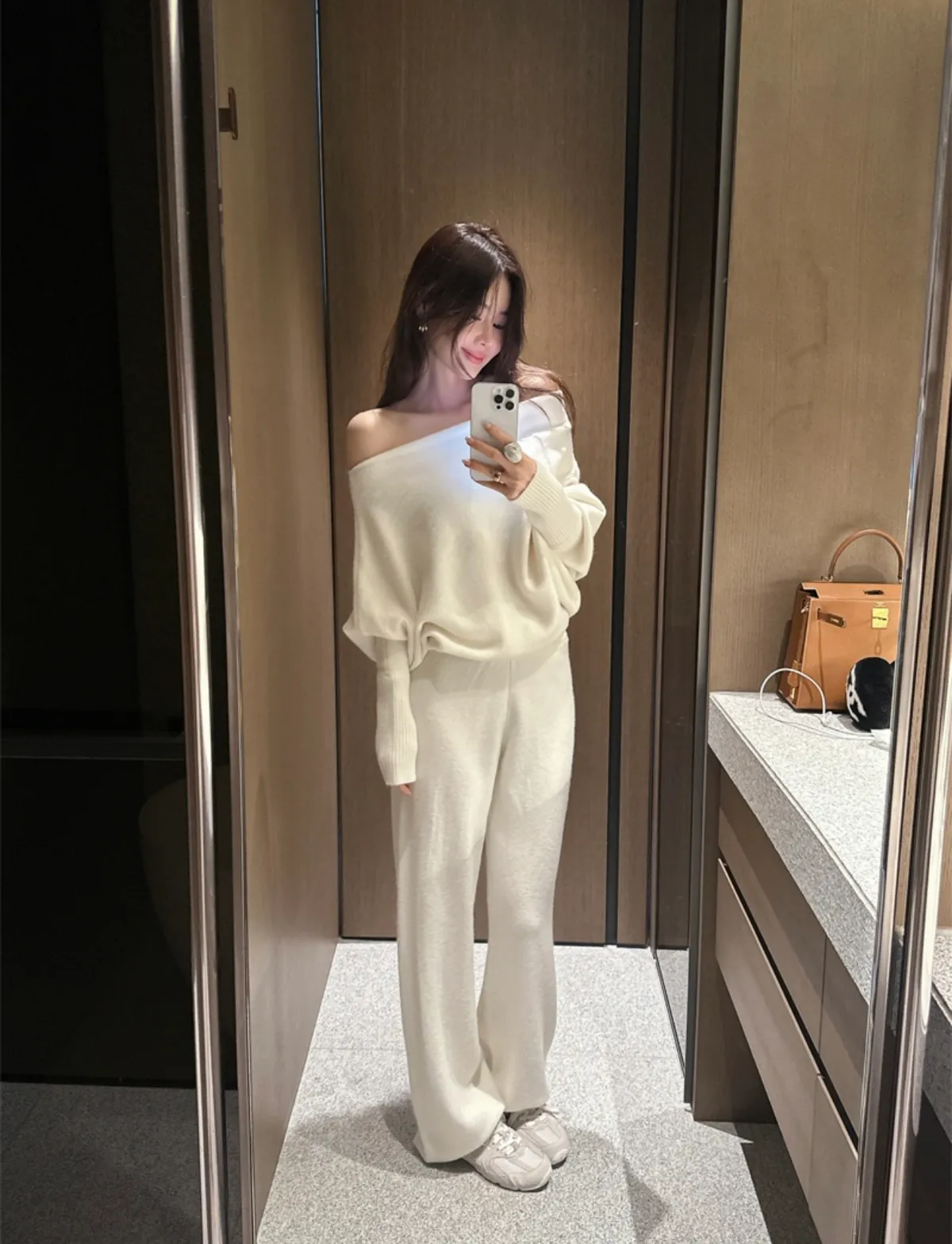不對稱肩線增添時尚感的針織衫和褲子組成的單品。