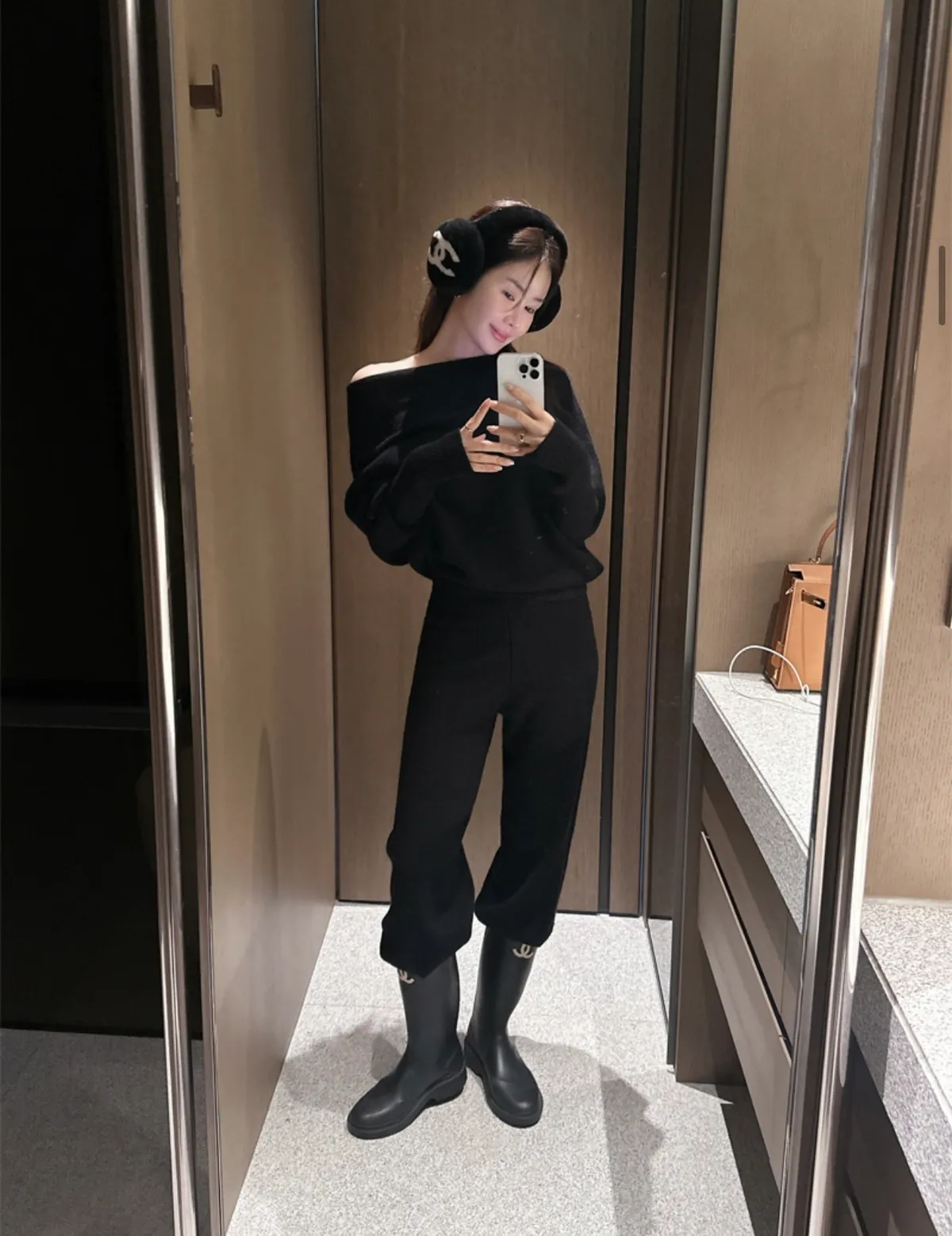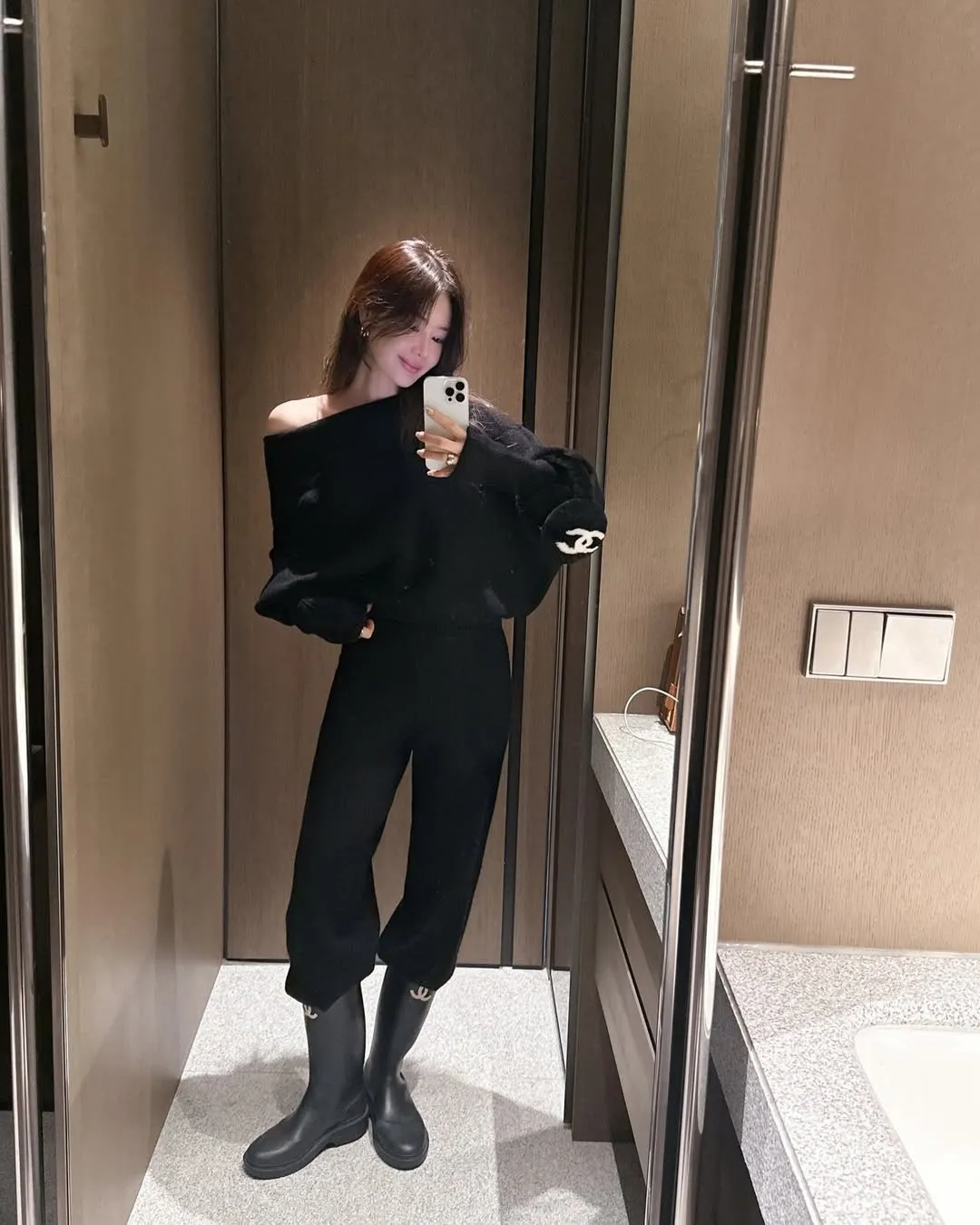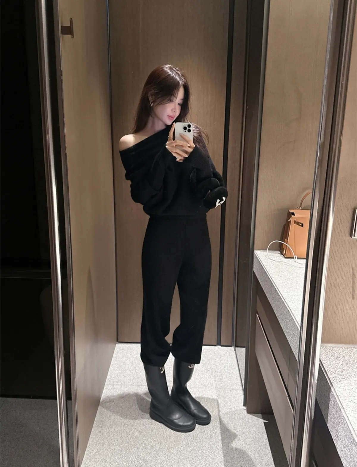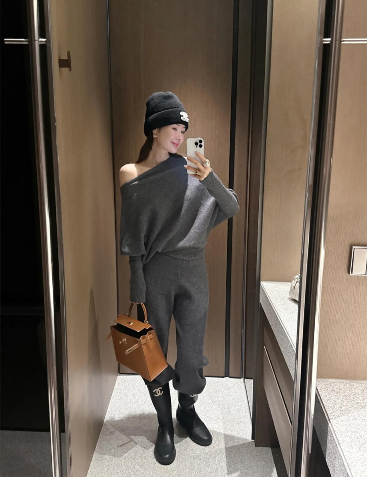 不對稱肩線增添時尚感的針織衫和褲子組成的單品。