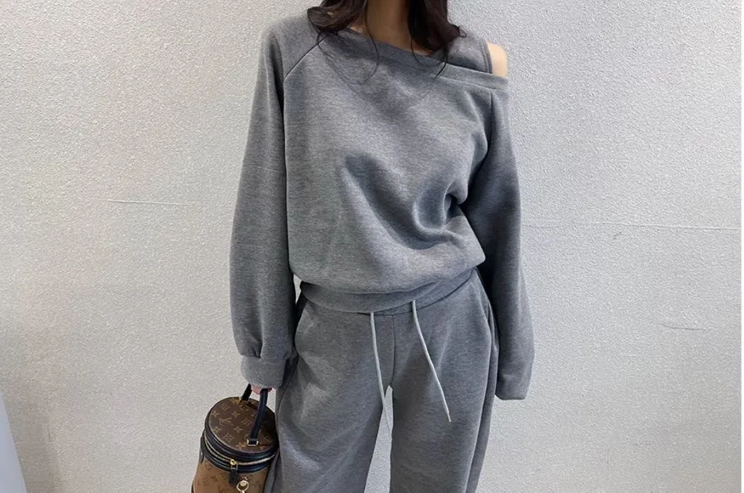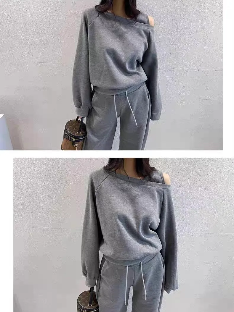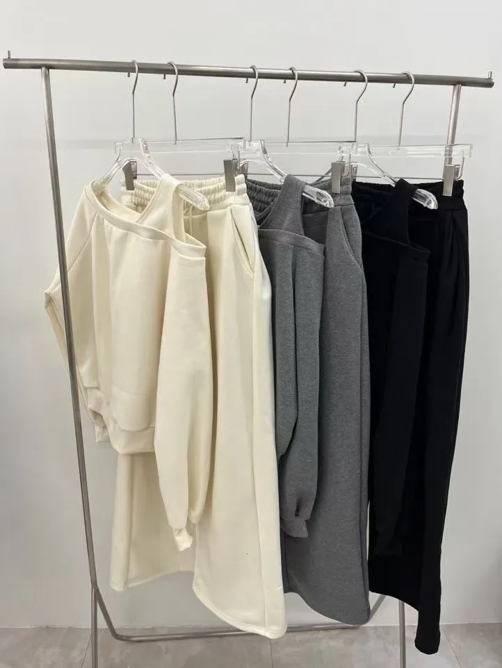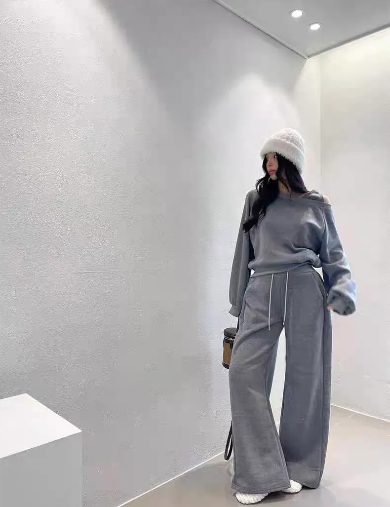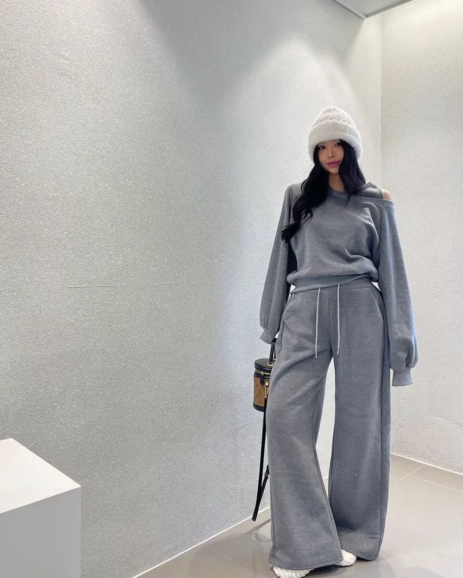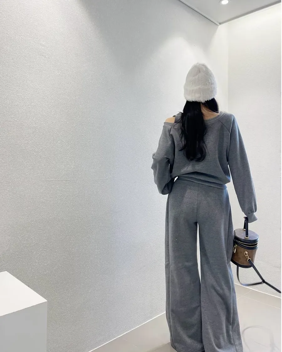 露單肩設計刷毛衛衣+休閒寬褲SET 3色