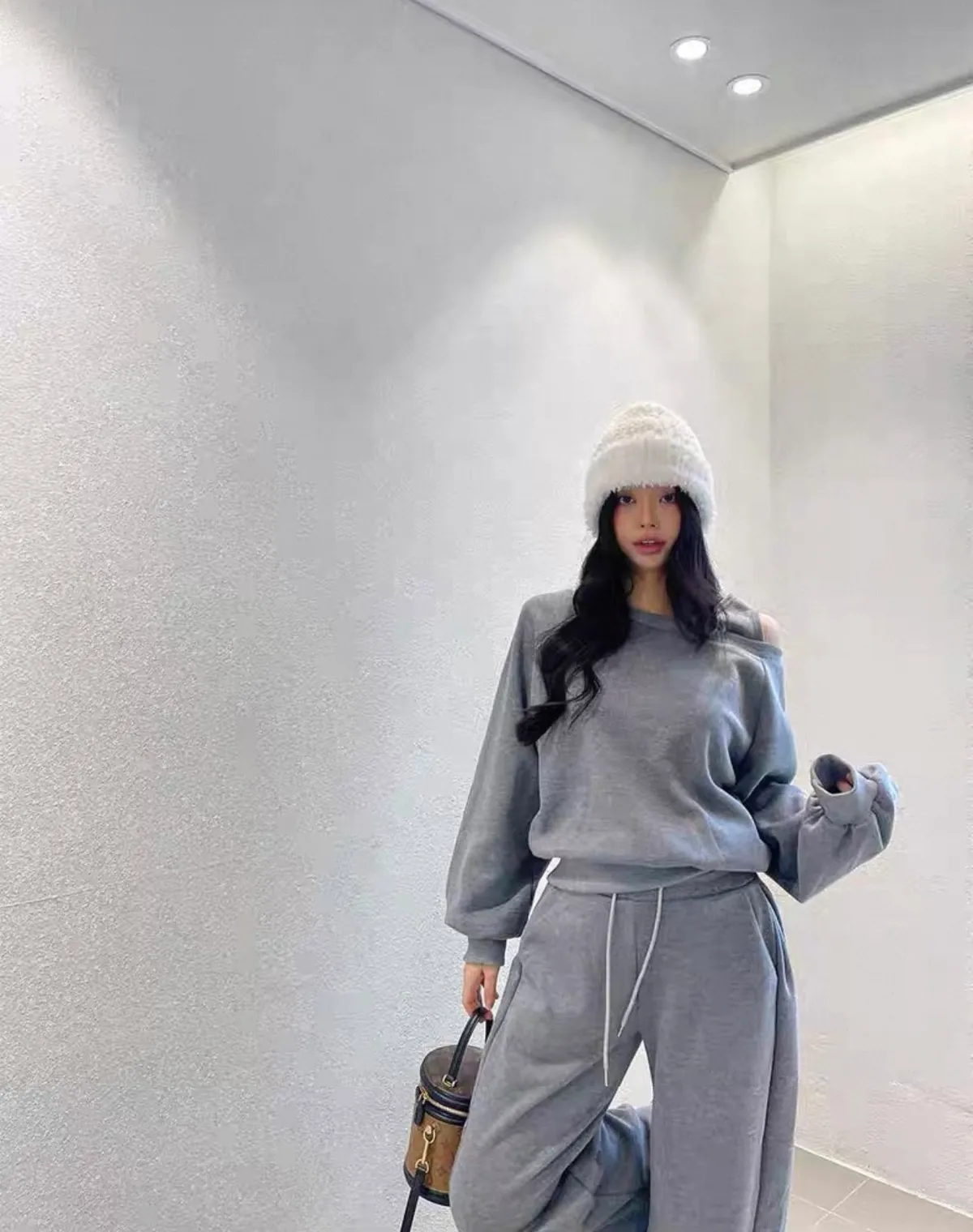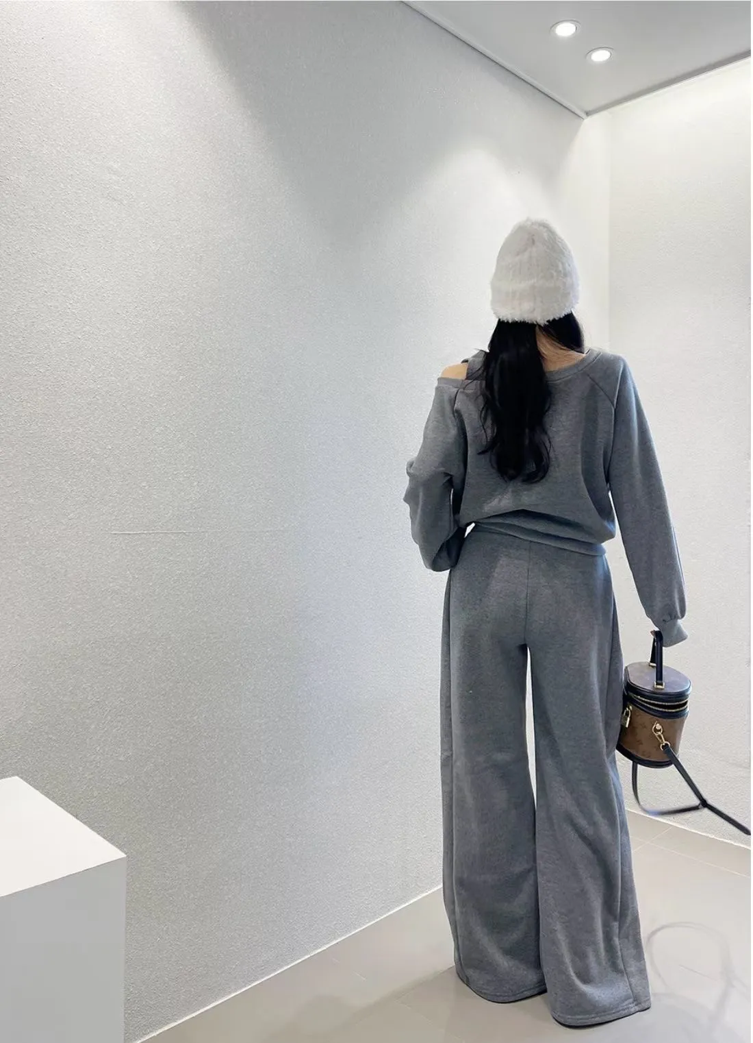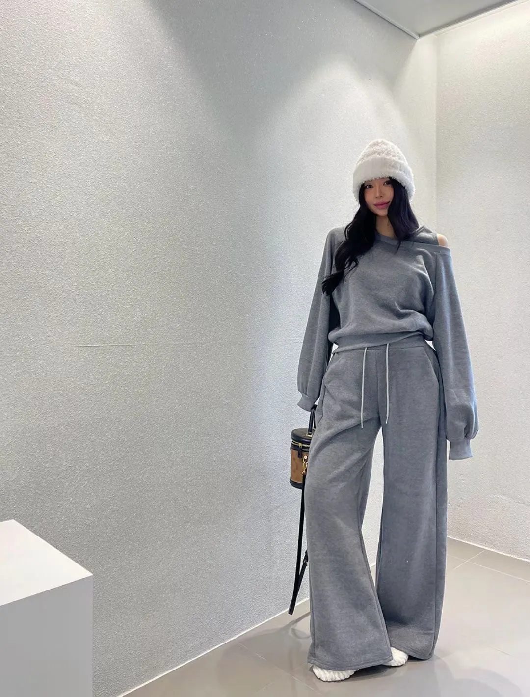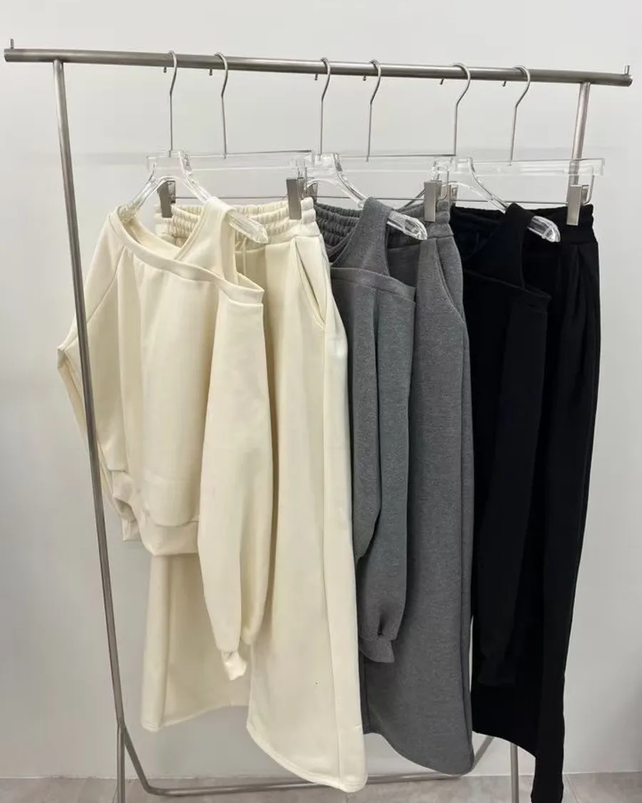 露單肩設計刷毛衛衣+休閒寬褲SET 3色