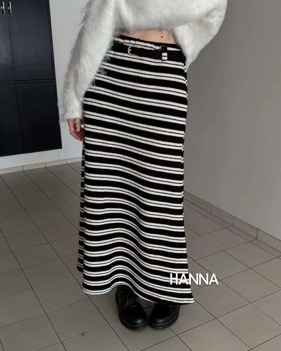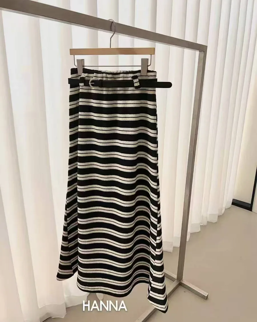 附腰帶鬆緊腰條紋長裙