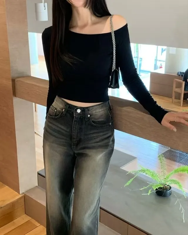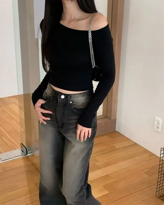 必包色露肩顯瘦短款長袖TEE 4色